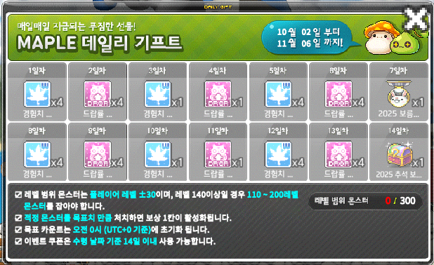 - 경험치/드랍률 쿠폰: 획득 시점으로부터 14일의 유효 기간이 적용됩니다. 기간 내에 꼭 사용해 주세요.