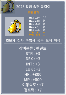 - ‘2025 황금 송편 목걸이’는 이벤트 기간에만 특별 능력치가 적용되며, 이벤트 종료 후에는 올스텟+2, 물리방어력 및 마법방어력 +50 옵션으로 변경됩니다.