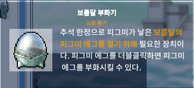 • 보름달 부화기는 헤네시스, 커닝시티, 엘리니아, 페리온, 노틸러스, 오르비스, 엘나스에 위치한 소환수 피그미 NPC를 통해 얻은 “보름달의 피그미 에그” 부화시킬 수 있는 특별한 아이템입니다.