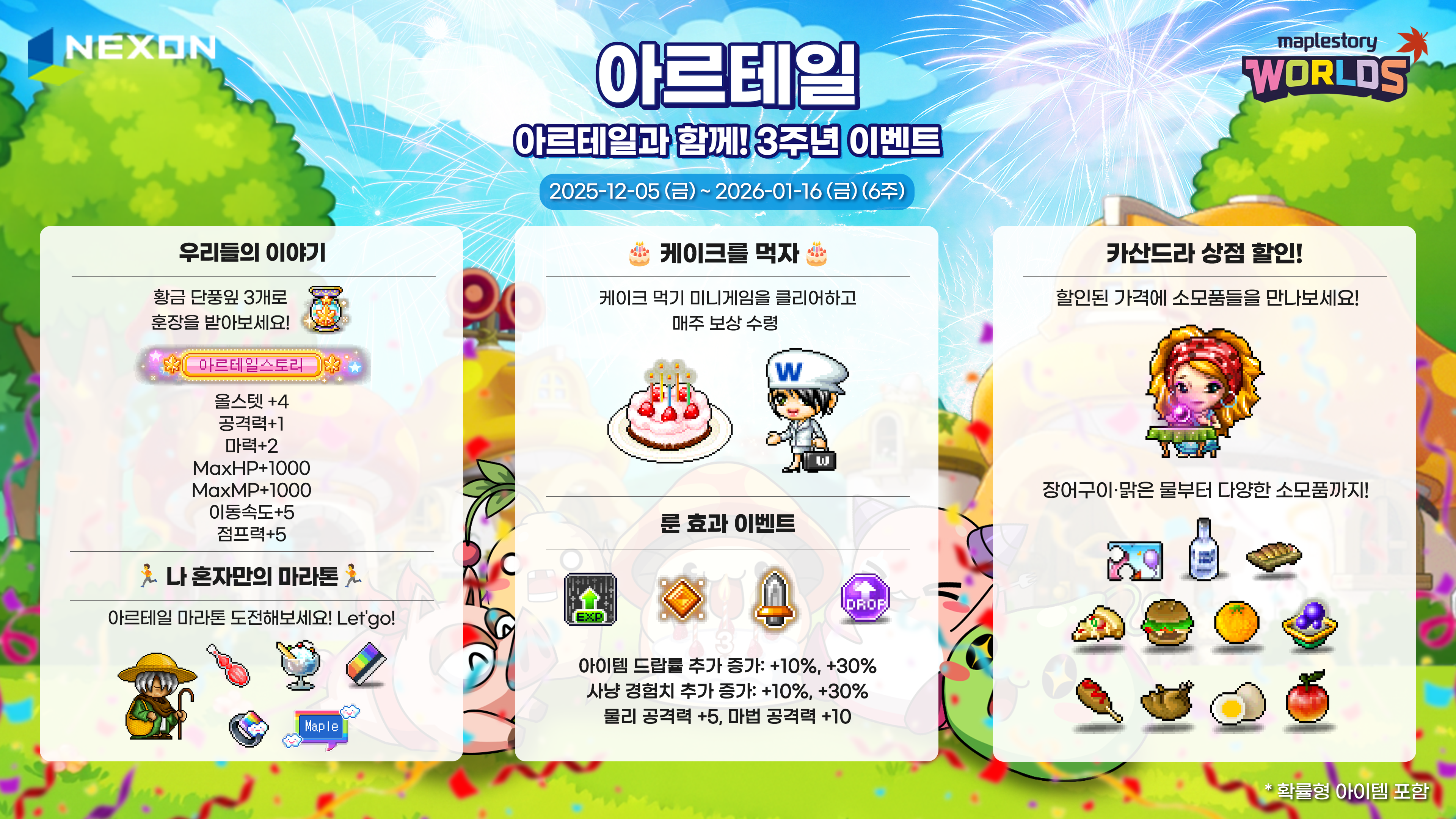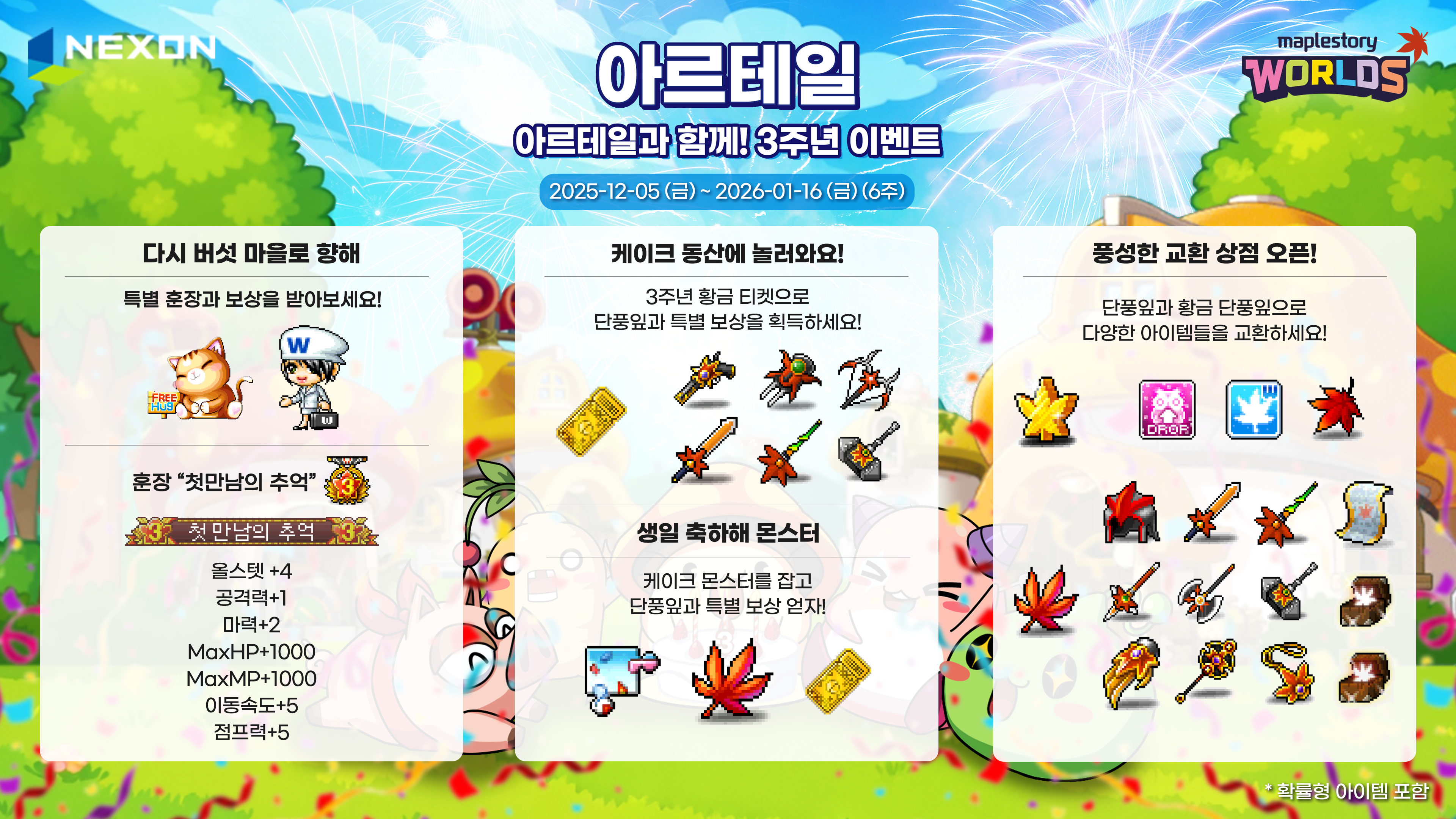 “아르테일과 함께! 3주년 이벤트”는 12월 5일(금)부터 2026년 1월 16일(금) 점검 전까지 참여하실 수 있습니다.