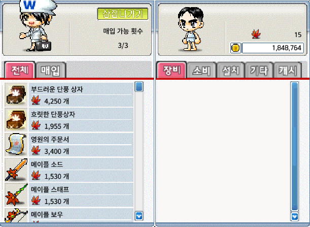 - 모든 아이템은 메소로 구매할 수 있습니다.