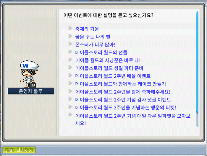 이벤트 정보는 마을에 있는 NPC 운영자 룰루를 통해서도 확인하실 수 있습니다.