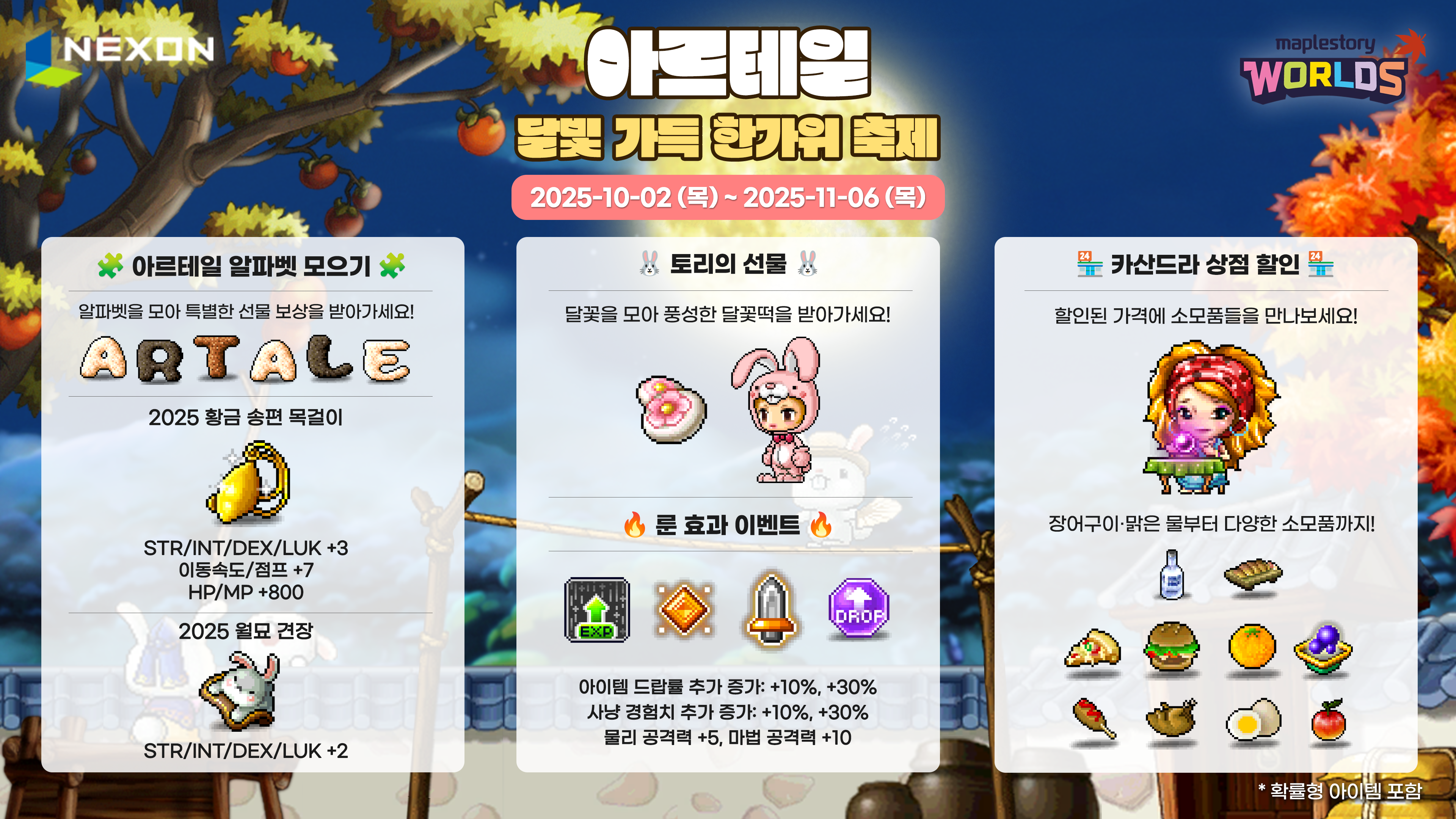 풍성한 한가위를 맞이하여, 아르테일에도 보름달처럼 가득 찬 즐거움과 이벤트가 찾아옵니다! 넉넉한 한가위 이벤트를 기다려주시고 기대해 주신 모든 유저 여러분께 진심으로 감사드립니다.